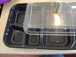 為BOPS材料,底為彩色貼膜的HIPS材料,用于快餐店的一次性飯盒。